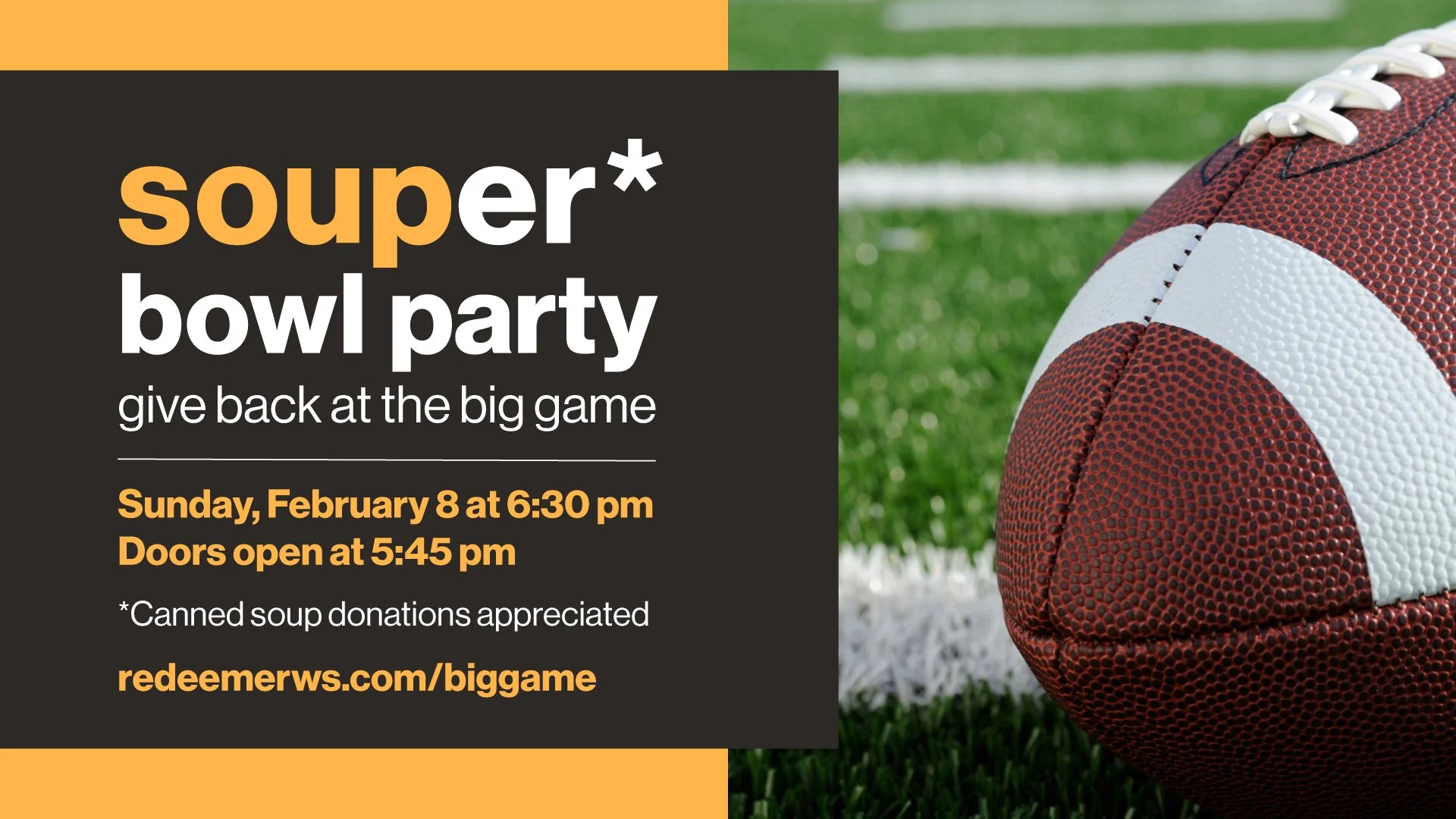 Watch the Big Game at the W83 Ministry Center! If you can, please bring a can of non-expired soup for our neighbors in need. Doors open at 5:45 pm; join us in the Loft for food, drinks (for all ages), and community. A suggested fee of $5 to offset food and beverage costs is encouraged. Please RSVP so we can have an accurate headcount for this event.